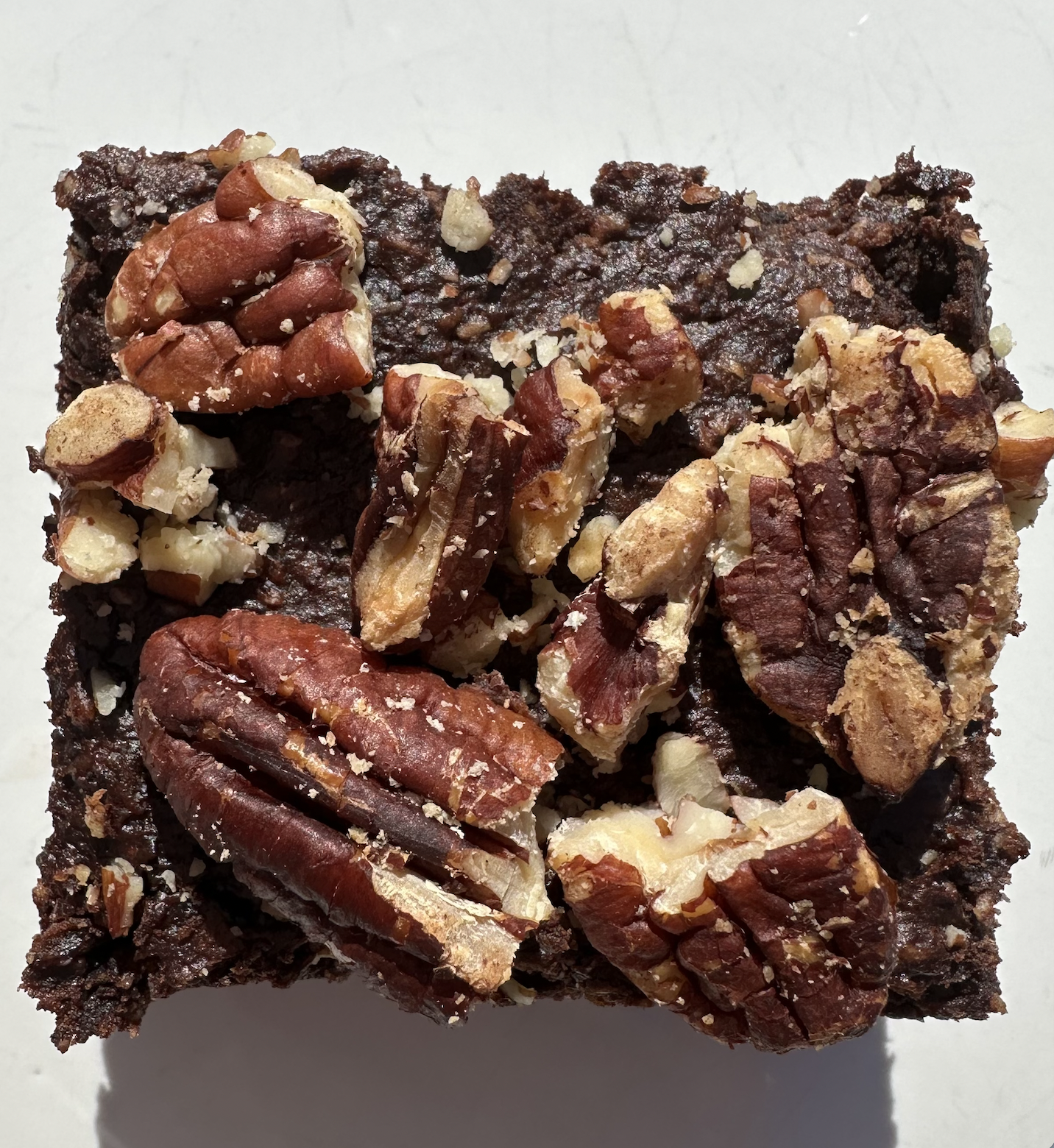Place batter into a lined baking tray. Smooth out the batter and then sprinkle over crushed pecans (optional). bake for 25-30 minutes at 180C. Stick a toothpick in the centre. The toothpick should come out mostly clean. Don't overcook. The brownies will continue to cook as they cool down.NOTES